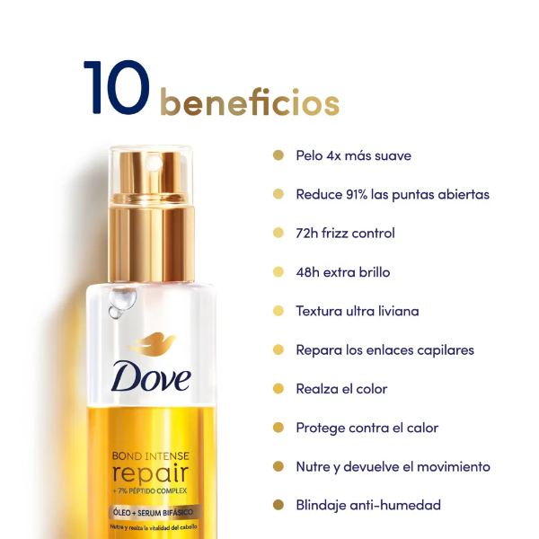 El Óleo Sérum Bifásico Dove Bond Intense Repair está formulado para reparar el cabello dañado, protegerlo de futuras agresiones y devolverle el brillo natural. Gracias a su combinación bifásica de aceites nutritivos y sérum restaurador, fortalece las fibras capilares desde adentro hacia afuera, dejando el pelo suave, sedoso y libre de frizz.